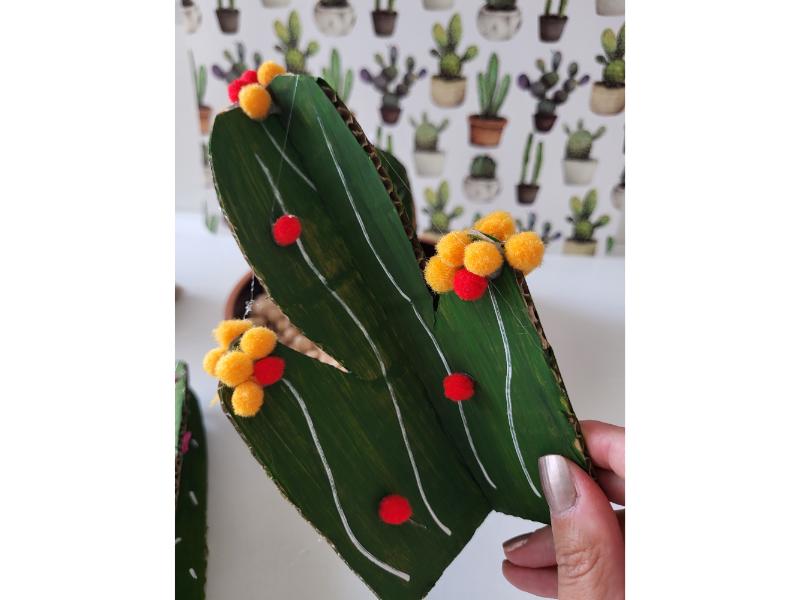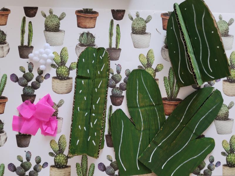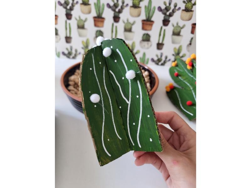 Σε ένα κομμάτι χαρτόκουτο σχεδιάζουμε τους κάκτους μας. Υπολογίζουμε περίπου το μέγεθός τους να είναι σαν την παλάμη μας και πιο μεγάλο. Σχεδιάζουμε διαφορετικά κομμάτια και σε πάχος και σε ύψος για να έχουμε ποικιλία. Ο κάθε κάκτος αποτελείται από δυο ίδια κομμάτια οπότε υπολογίζουμε και κόβουμε σε ζευγάρια. Έπειτα τα βάφουμε στις αποχρώσεις του πράσινου και από τις δυο πλευρές.