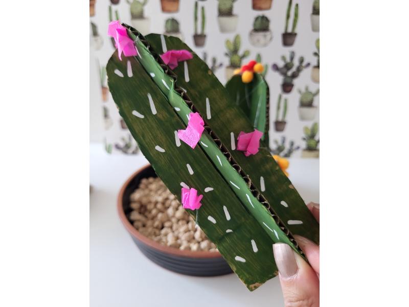 Περνάμε στο τελικό στάδιο της κατασκευής μας που είναι να βάλουμε στους κάκτους λουλουδάκια. Αν έχουμε πομ πομ τα κολλάμε διάσπαρτα αλλιώς τα ομαδοποιούμε για να φτιάξουμε μικρά λουλουδάκια στις κορυφές των φυτών μας (βλ. φώτο αριστερά). Αν θέλουμε να χρησιμοποιήσουμε και γκοφρέ χαρτί το κόβουμε σε τετραγωνάκια, τα τσαλακώνουμε και στολίζουμε τους κάκτους μας με αυτά.