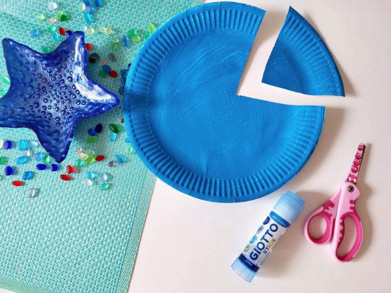 Ξαναγυρνάμε στο πιάτο μας και εφόσον έχει στεγνώσει κόβουμε ένα τριγωνικό κομμάτι που αφαιρόντας το έχουμε φτιάξει ένα στόμα για το ψαράκι μας και το οποίο στη συνέχεια το κολλάμε στην απέναντι πλευρά για να δημιουργήσουμε έτσι την ουρά του ψαριού μας.